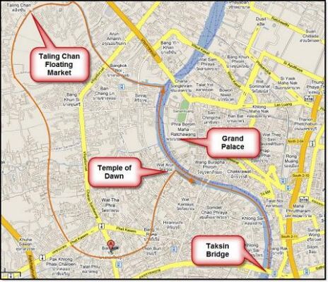 Taling Chan is located across the Chao Praya River, northwest of the Royal Palace in what used to be Thonburi village until it became incorporated into Bangkok.